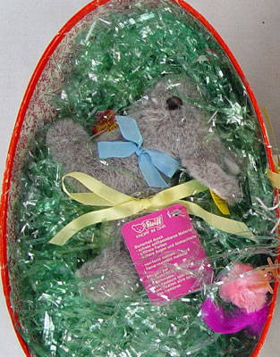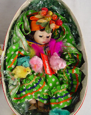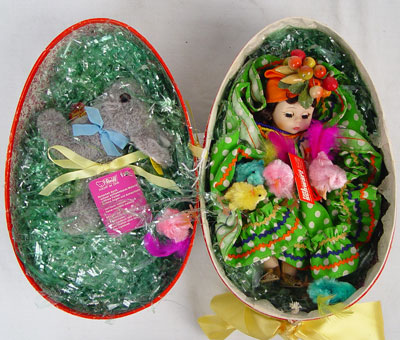 FAO SCHWARTZ EASTER EGG WITH STEIFF RABBIT & MADAME ALEXANDER BRAZIL DOLL: In original box, made exclusively for FAO Schwartz. Doll 8'' tall, egg 9 1/2'' x 6 1/2'' x 7'' approx.