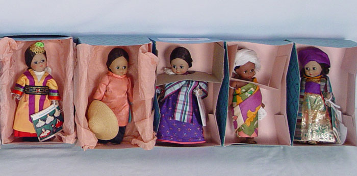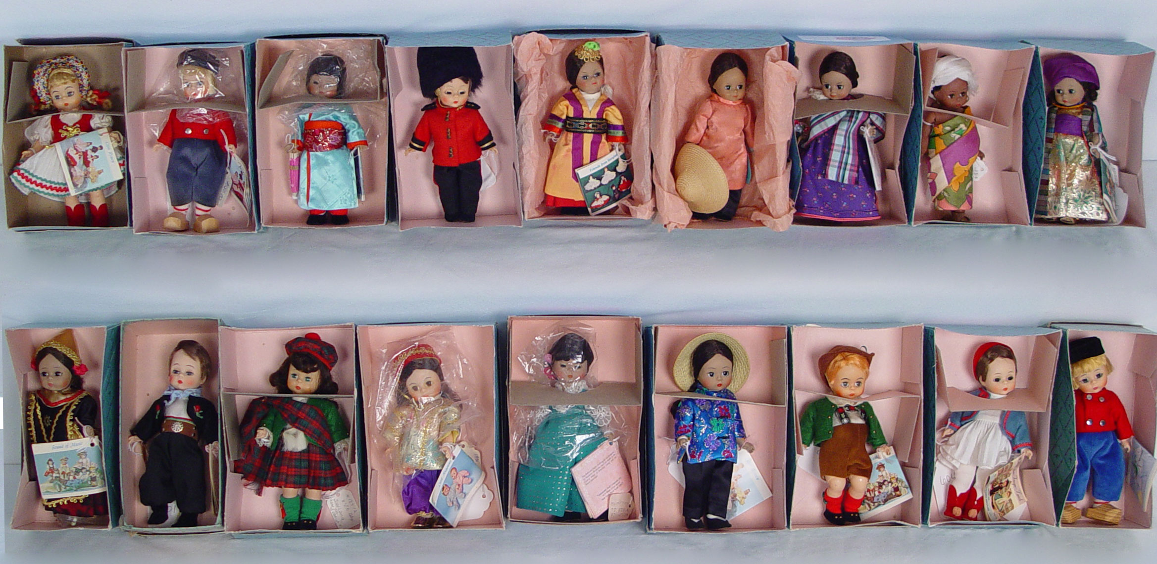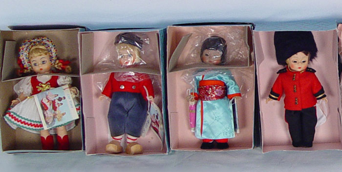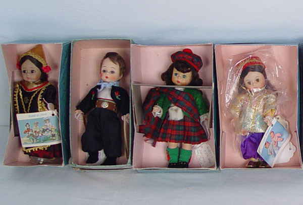LOT OF 18 MADAME ALEXANDER INTERNATIONAL DOLLS IN BOXES 8'': China, Philippines, Turkey, Greece, Laos, English Guard, Morocco, Africa, Vietnam, Korea, Japan, Netherlands Boy, Hungary, Austria Boy, Scotland, Argentina, Dutch Boy, and Indonesia. All in the boxes.