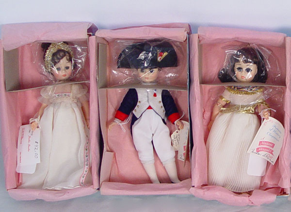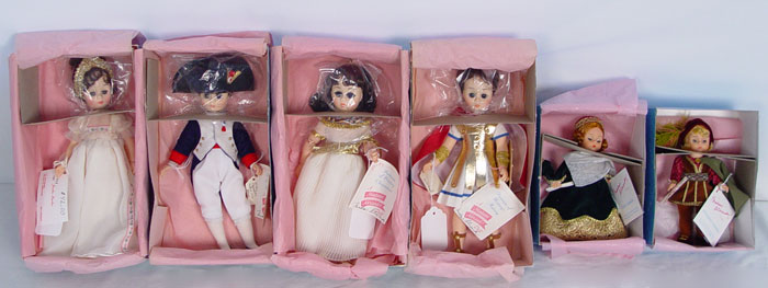 6 MADAME ALEXANDER PORTRAIT IN HISTORY ISABELLA & COLUMBUS DOLLS: Includes Queen Isabella 8''; Christopher Columbus 8''; Napoleon 12''; Marc Antony 12''; Cleopatra 12'' and Josephine 12''. All in original boxes.