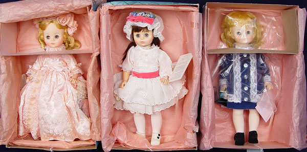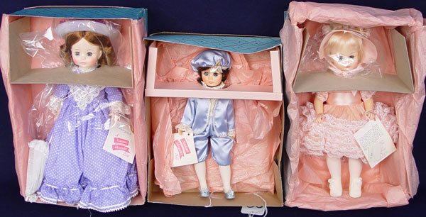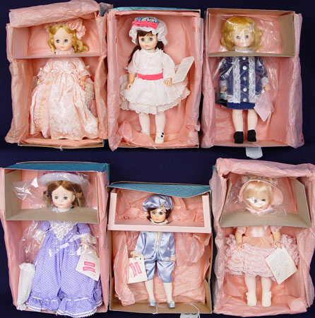 6 MADAME ALEXANDER PORTRAIT CHILDREN DOLLS: Includes Dagas Girl, 2 Renoir, Sergeant, Madame Doll and Blue Boy. All 14'' tall and in original boxes.