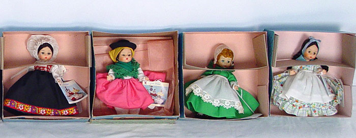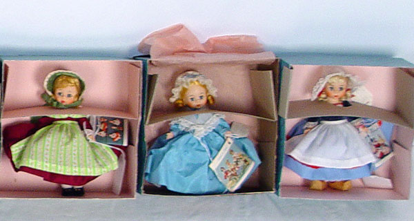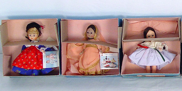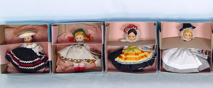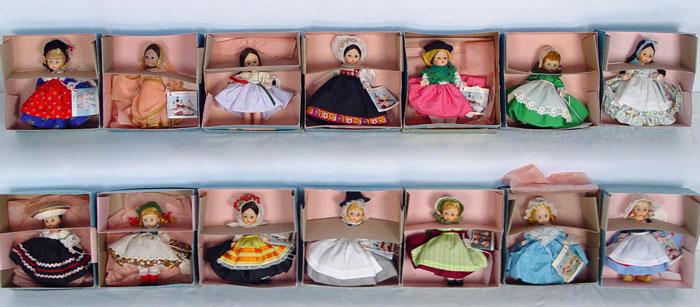 14 MADAME ALEXANDER INTERNATIONAL 8 INCH DOLLS: Includes dolls representative of Mexico, Austria, Germany, India, Israel, Norway, Greece, Denmark, Portugal, Ireland, Netherlands, Great Britain, Argentina and the United States. 8'' tall. All original boxes.