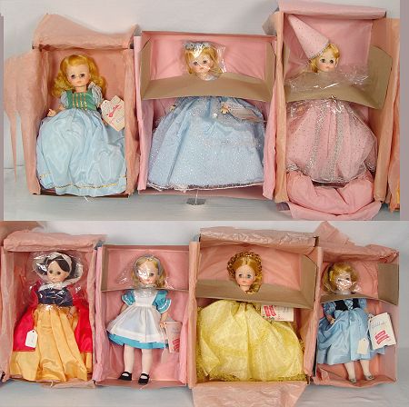 6 MADAME ALEXANDER 14'' FAIRY TALE DOLLS: In their boxes- Includes Alice, Snow White, Goldilocks, Cinderella, Sleeping Beauty, Cinderella (blue dress) and Fairy God Mother. All 14'' tall.