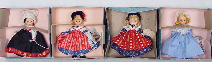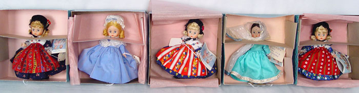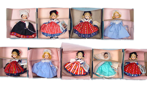 9 MADAME ALEXANDER INTERNATIONAL 8 INCH DOLLS: Includes 5 Germany dolls, 2 United States, 1 Norway and 1 India doll. In the boxes.