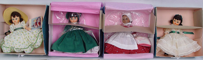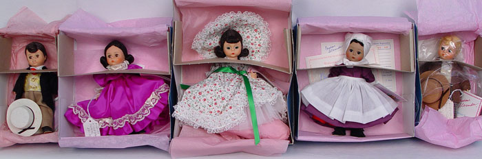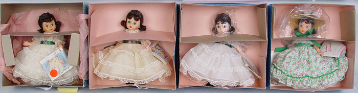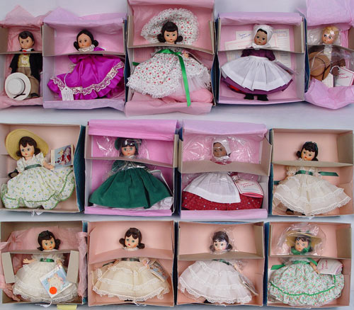 13 MADAME ALEXANDER GONE WITH THE WIND DOLLS: Included are Prissy, Scarlett (purple), Scarlett (white), Scarlett (white/green). All 8'' tall. Original boxes.