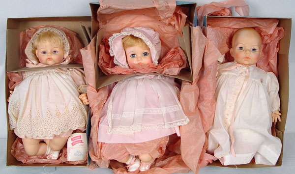 3 MADAME ALEXANDER BABY DOLLS IN BOXES: Includes Victoria (sleep) 19'', Baby Lynn 17 1/2'' and Baby McGuffy 19''.
