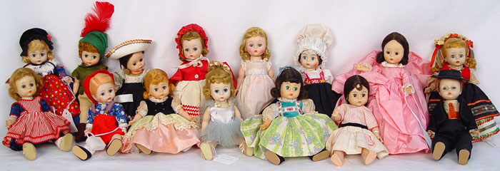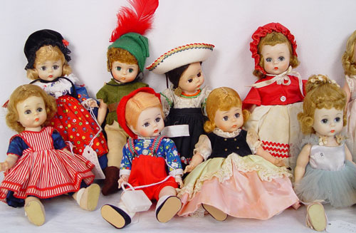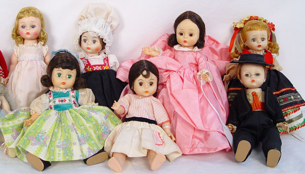 15 MADAME ALEXANDER 8'' DOLLS INCL. WENDY KINS: Amish Boy, Red Riding Hood, all hard plastic, some with bent knees.