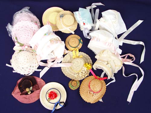 27 DOLL HATS AND BONNETS: 19 straw and straw type, 8 bonnets, and a velvet hat. Sold as a lot.