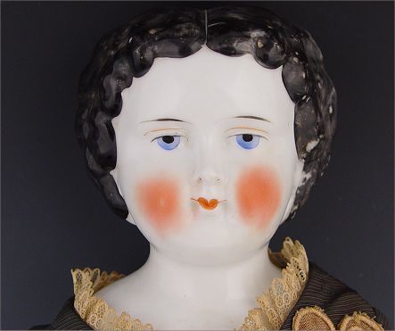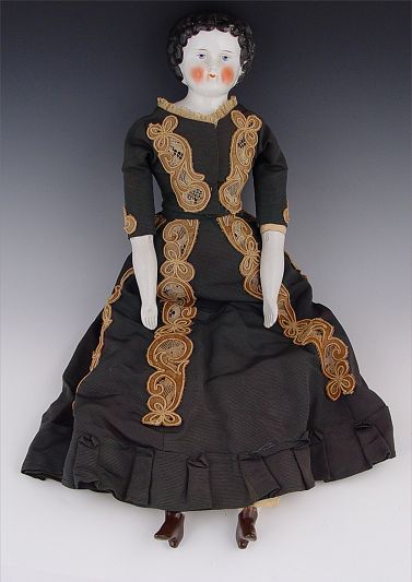 PORCELAIN CHINA SHOULDER HEAD DOLL: China feet and hands. Period voile and lace coat and skirt, 25'' tall.