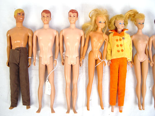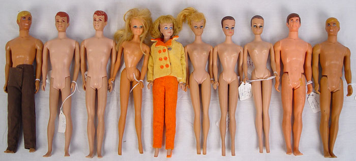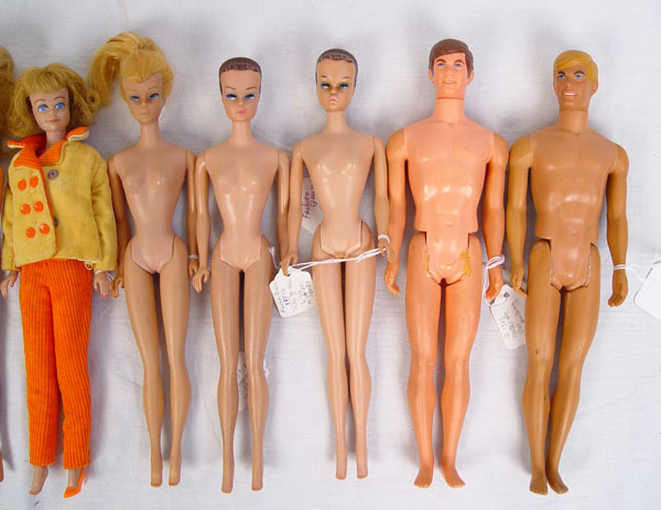 10 PIECE LOT OLD BARBIE KEN AND ALAN DOLL LOT: Includes 4 Barbies (unclothed) 1964, 1968, 1958, & 1961. Also included Ken 1969 12'', 2 Kens 1968 & 1970 both 12'', 2 Alan's 1964 both 12'', 1 Midge 11'' dressed and 1 red wig for Barbie.