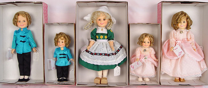 5 IDEAL SHIRLEY TEMPLE DOLLS IN BOXES: Includes 8'' Shirley 1982, 8'' Shirley Oriental 1982, 12'' Shirley as Heidi (never out of box) 1982, 12'' Shirley as Oriental, 12'' Shirley in pink with locket.