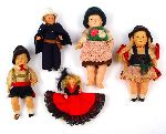 5 SMALL VINTAGE CELLULOID DOLLS: Pair of 5'' dolls dress in Swiss outfits, 1 dressed in crochet outfit, 5''. 1 dressed in police outfit, 4'' and one 3'' dressed in Can Can outfit. |