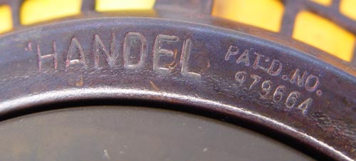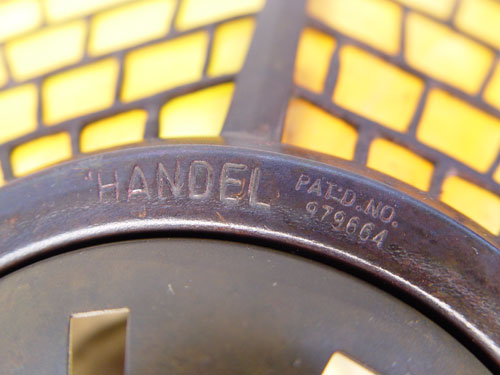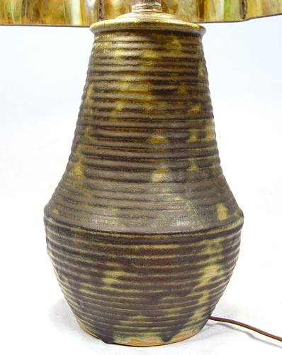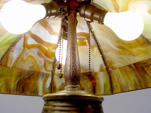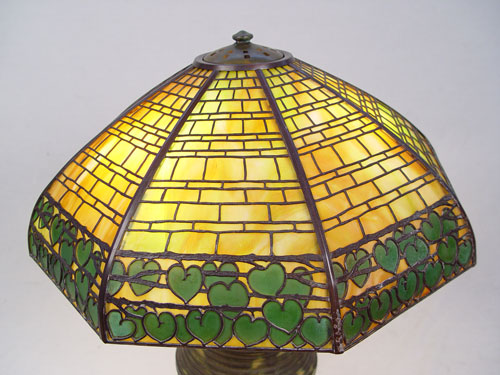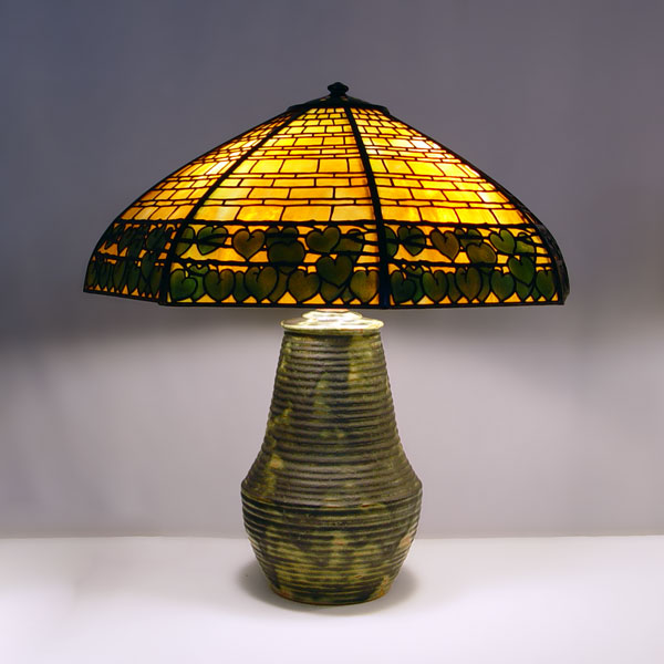FULPER POTTERY & HANDEL DOUBLE IVY TABLE LAMP: 8 panel Staggered Brick with Double Ivy Border shade, signed Handel, over a signed Fulper pottery base. The lamp is 23 1/4'' high, shade is 20 1/4'' dia. Three sockets, pull chains. Please note restoration to base.