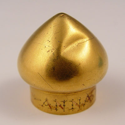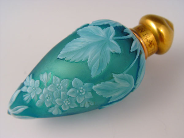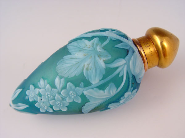 19th C ENGLISH CAMEO GLASS SCENT BOTTLE / PERFUME: Webb quality carved cameo glass scent bottle. The cover is inscribed to ''Anna Head'', the interior neck is inscribed ''Xmas '84 Mama''. 3 1/2'' long. The glass is free of chips or cracks, the lid does have a dent.