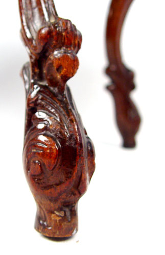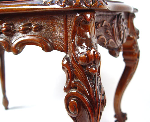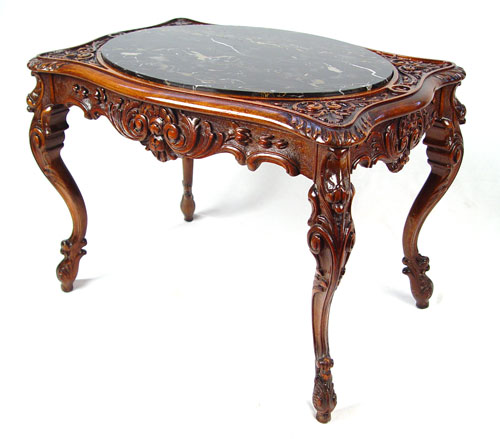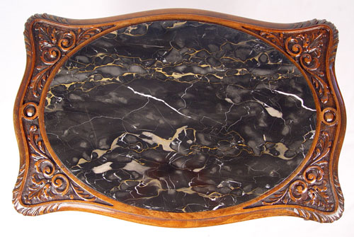 CARVED FRENCH BLACK MARBLE TOP SIDE TABLE: Oval marble insert, intricately carved. 19 1/2''h. x 25'' x 16''.
