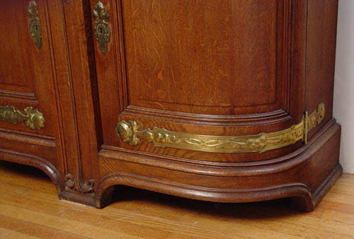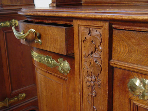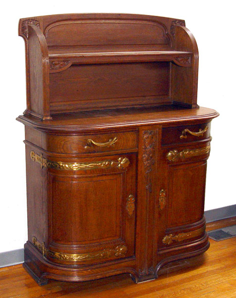 CONTINENTAL ART NOUVEAU OAK AND BRASS MOUNTED SERVER: Grape and vine carvings with stem form pulls. 63 1/2'' high x 49'' wide x 22 1/2''. deep Matches the sideboard at previous lot 1018.