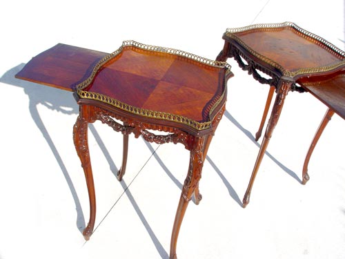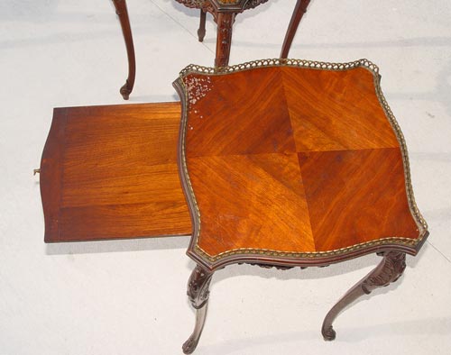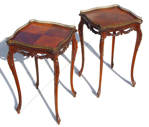 PAIR FRENCH FLORAL FESTOON TABLES: Bookmark veneer top. Carved legs with floral garland. Measures 29 1/4'' high x 18'' square top. Note foxing to finish one corner.