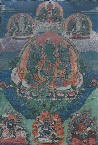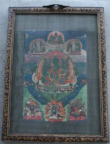 EARLY ASIAN THANGKA PAINTING: 19'' x 12 3/4'' image size, on silk, encased in black lacquer frame, 28'' x 21''.