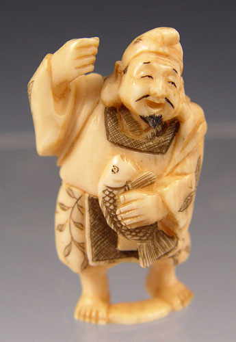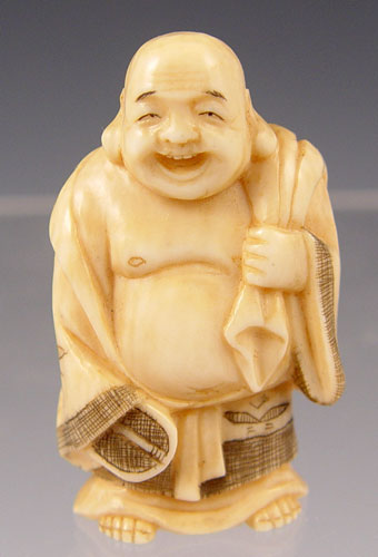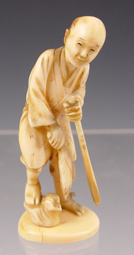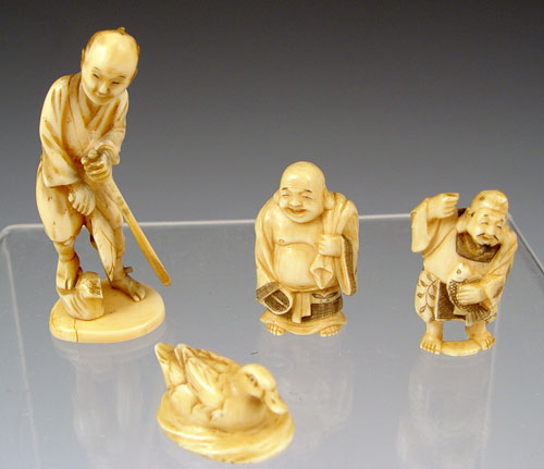 4 PIECE JAPANESE CARVED IVORY NETSUKE AND MINIATURE OKIMONO: 1) Signed water fowl figural netsuke, 3/4'' tall. 2) Signed Buddha Okimono, 1 1/2'' tall 3) Fisherman okimono, 1 1/2'' tall, missing his pole 4) Signed Okimono figure of a man with stick (broom maker?), 3 1/2'' tall.