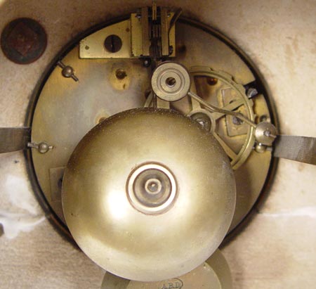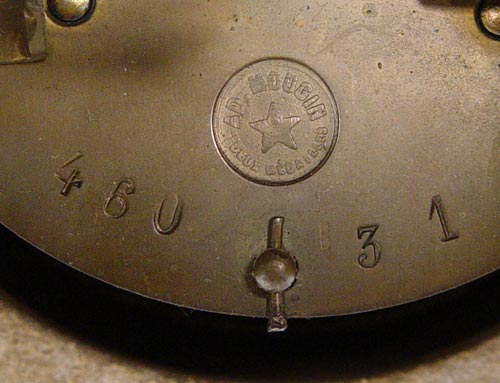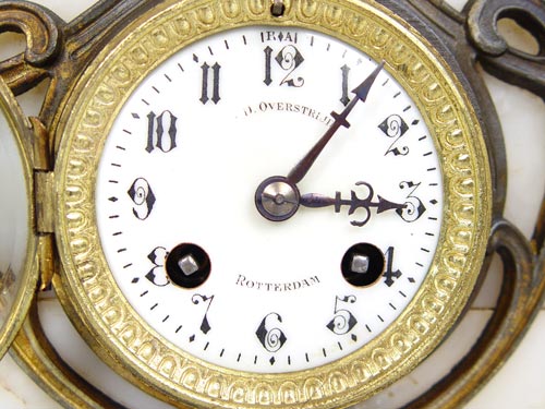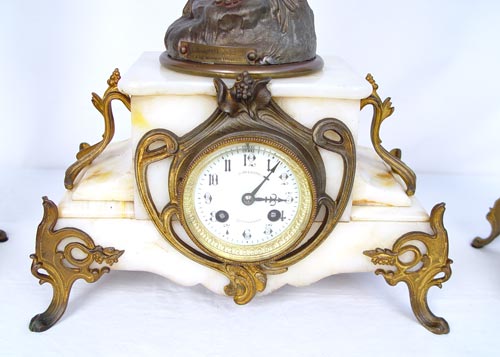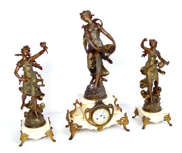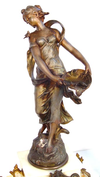 FRENCH MOUGIN FIGURAL CLOCK GARNITURE SET: Turn of the century with AD Mougin makers name on works. Spelter casting of Moreau's ''La Source'' on top of clock. 3'' Porcelain face with Dutch dealers name D. Overstriped Rotterdam and Arabic numerals. Key and pendulum works. Marble base with cast metal accents and feet. 2 piece accompanying garniture set with spelter castings of Moreau's ''Rein des Flots'' and ''Reveil de Mai''. Matching footed marble bases. Clock measures 26'' high x 13'' wide x 6 3/4'' deep. Garniture measures 21'' high x 9 1/2'' x 7 1/2''. Please note flower broken off one garniture.