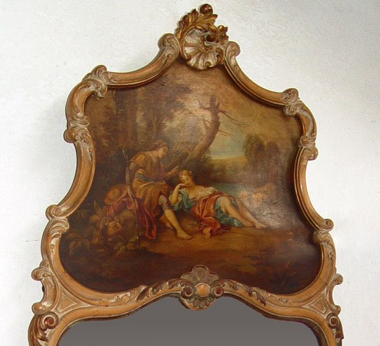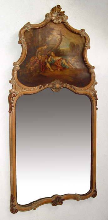 FRENCH PAINT DECORATED TRUMEAU MIRROR: Hand painted courting scene on a Bombay panel over shaped mirror. Shell and scroll carved frame with red highlights. Measures 54'' high x 27'' wide. Painted panel approx. 16'' x 22''.