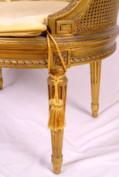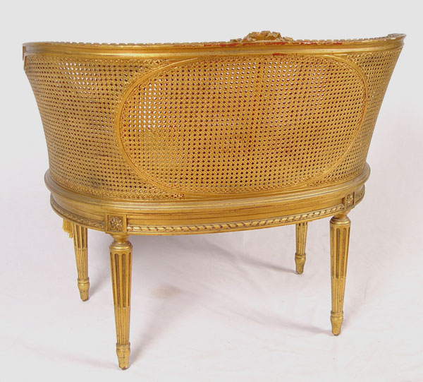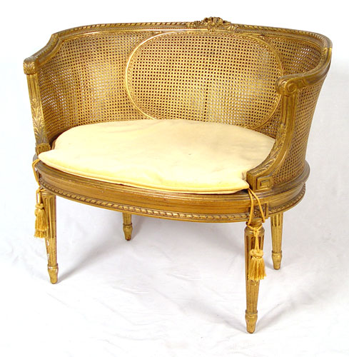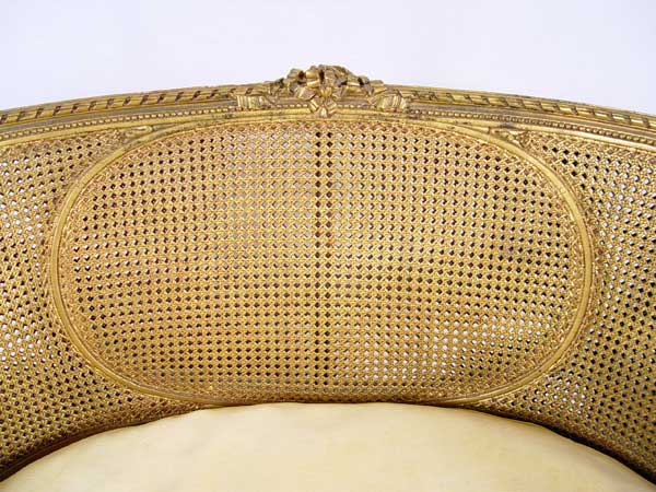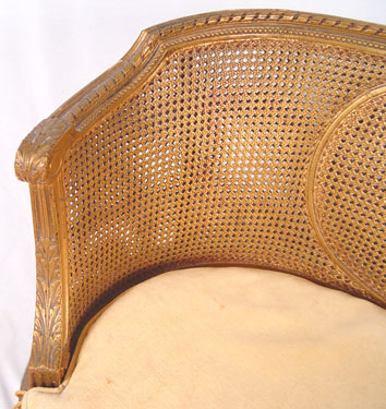 LOUIS XVI STYLE FRENCH CANED SETTEE: Double caned back and sides, single caned seat removable cushion. Gilt finish. Measures 29'' high x 33'' wide x 24'' deep.