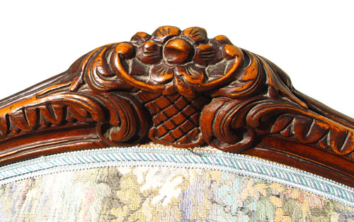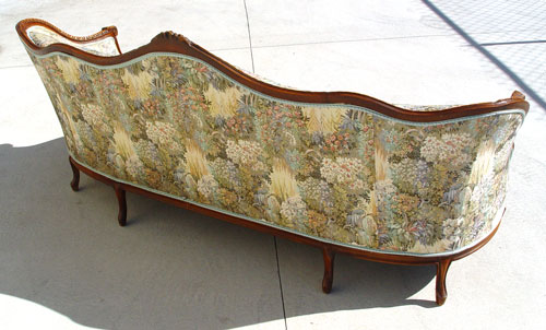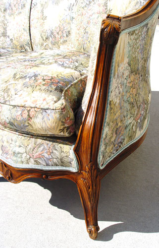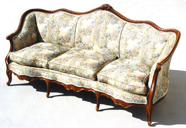FRENCH STYLE CARVED FULL SIZE SOFA CA. 1940'S: Featuring upholstery in the colors of Monet. 76'' long x 37 1/2''h.