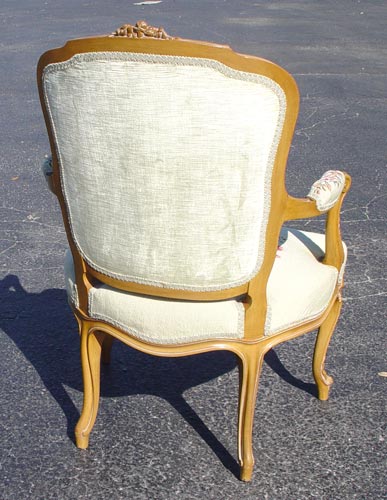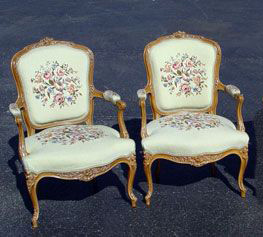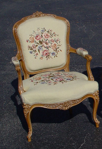 PAIR FRENCH STYLE NEEDLEPOINT OPEN ARM CHAIRS: Carved frames fitted with floral needlepoint. Early 20th C. 37 1/2'' high x 25 1/2'' wide x 27'' deep.