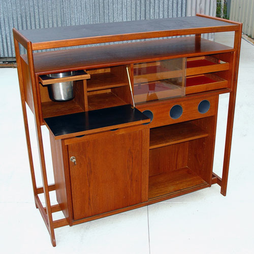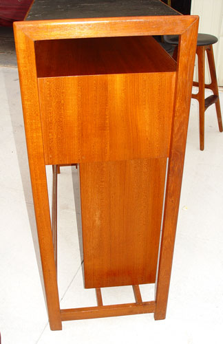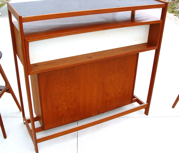 DYRLUND SMITH DANISH MODERN TEAK BAR: Bar marked Dyrlund Smith. 46 3/4'' high x 49'' wide x 19'' deep. Top needs work, bottom brace has been glued/repaired.