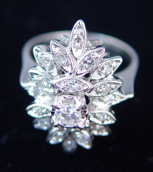 WHITE GOLD AND DIAMOND COCKTAIL RING: 14K white gold diamond cluster ring with one round brilliant cut diamond (approx. .15 Ct.) and 18 round single cut diamonds (approx. .35 CTW). Approx. .50 CTW The .15 Ct. diamond is rated I1 in clarity and H-I in color. The small diamonds are rated VS in clarity and H-I in color. The diamonds are prong set. Size 7 1/2 Weight: 6.4 grams.