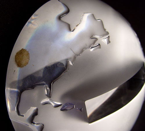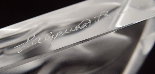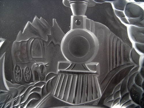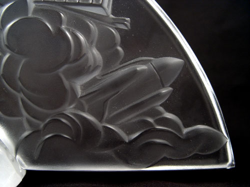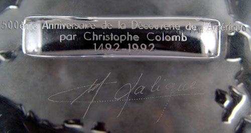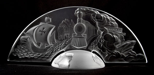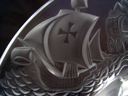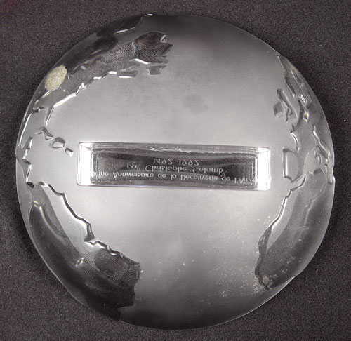LALIQUE COMMEMORATIVE 500TH ANNIVERSARY DISCOVERY OF AMERICA: Table top glass plaque in 2 sections with designs of Columbus ship, train, wagon, streetcar, and Space Shuttle. World base. Measures 6'' high x 14 1/4'' wide. In original box.