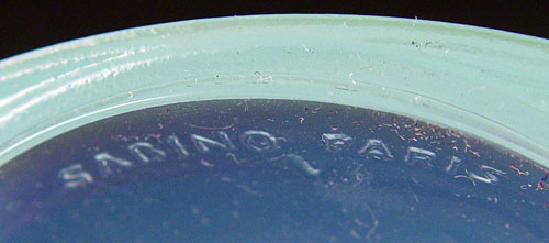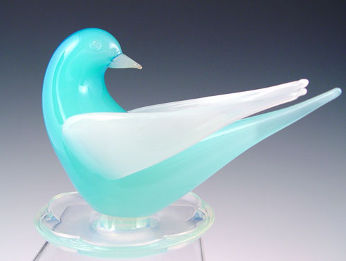 SABINO FRENCH ART GLASS DOVE TRAY: Dove with head back, blue opaque glass body and white glass wings. Sits on iridescent tray marked Sabino Paris. Measures 5 1/2'' high x 7 1/2'' wide.