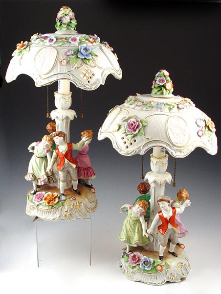 PAIR SCHIERHOLZ GERMAN PORCELAIN FIGURAL LAMPS WITH LITHOPANE SHADES: Figural bases under lithopane panel shades. Flower encrusted shades. 19''h, shade is 11'' dia.