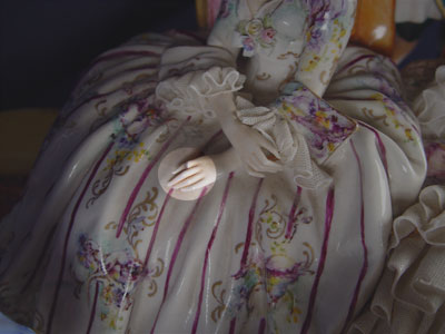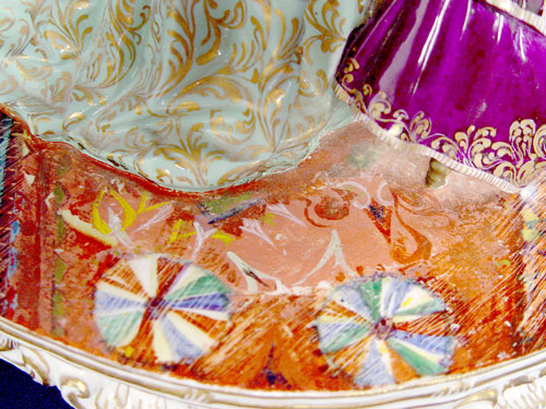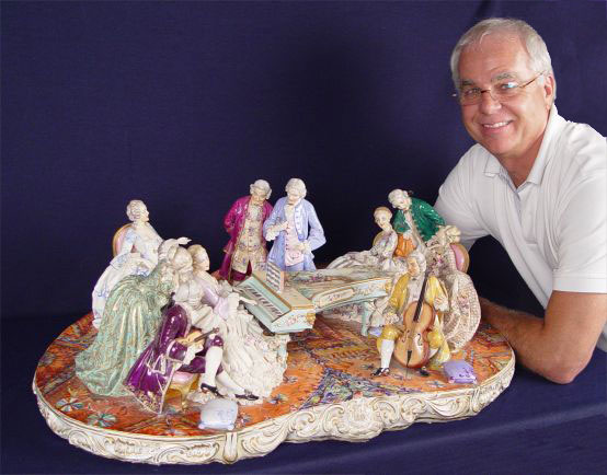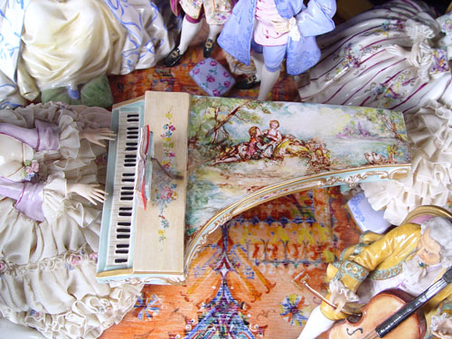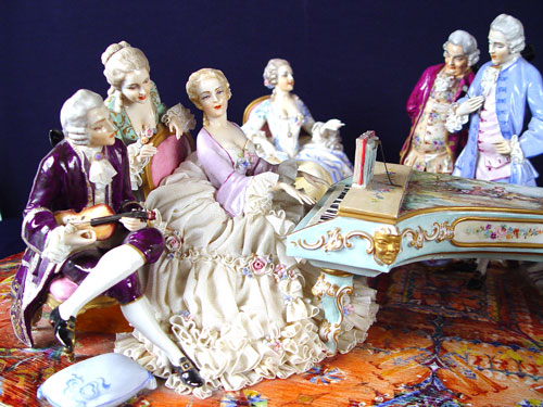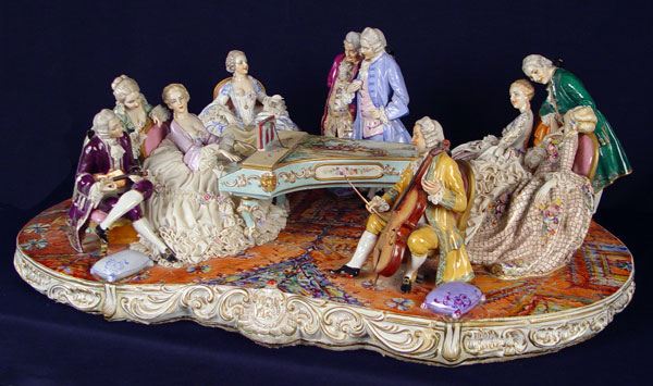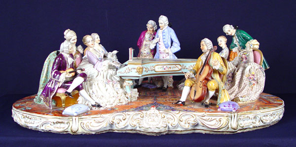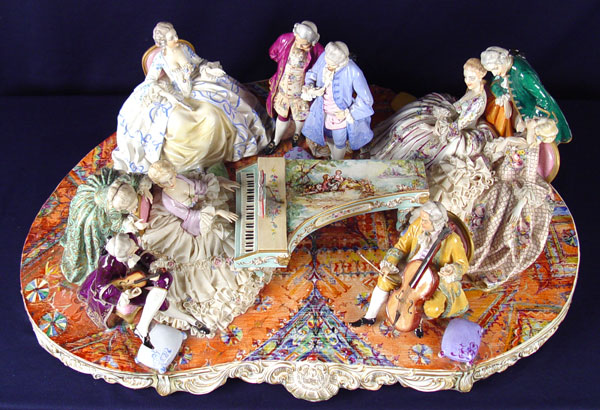 THE GRANDEST 10 FIGURE FABRIS ITALIAN PORCELAIN GROUPING: Great detail from the scenic painted piano down to the oriental carpet. Measures 10'' x 32'' wide x 20'' deep.
