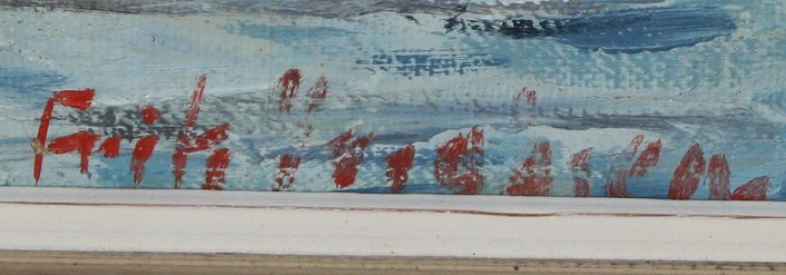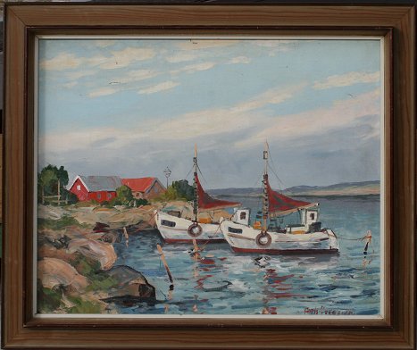 ILLEGIBLY SIGNED DANISH? COASTAL SCENE WITH BOATS: OIL/C, 15 1/2'' x 19 1/2'', framed, 19'' x 23''. Several flecks of paint loss in sky.