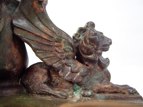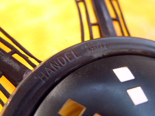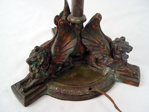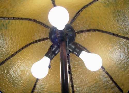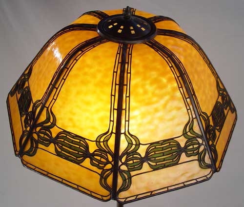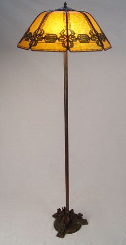 HANDEL NUTMEG OVERLAY FLOOR LAMP: Handel Griffin floor base with the very Arts & Crafts Nutmeg Overlay domed 8 panel shade. 3 socket, pull chains. 58 1/4'' high x 10'' base dia. Shade is 19 1/4'' dia. Shade is signed.
