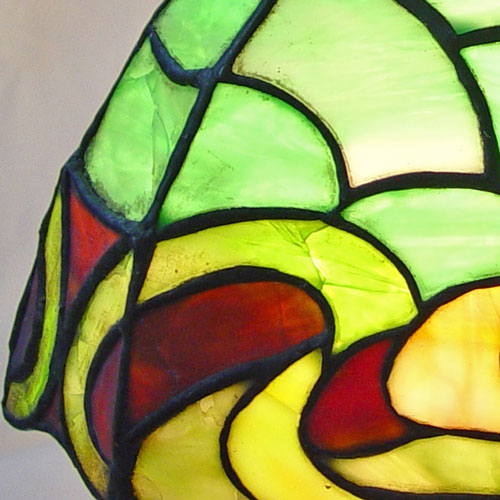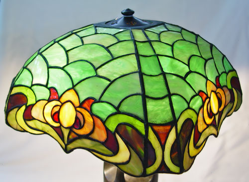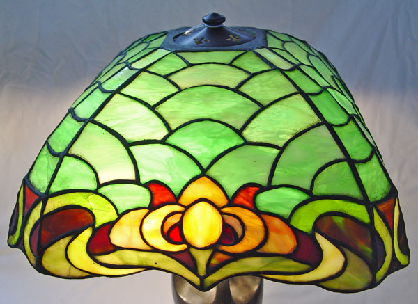 DUFFNER & KIMBERLY LEADED GLASS OWL SHADE: 15'' shade. Please note several (approx. 3-4) cracks in tiles.
