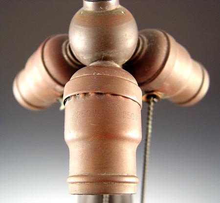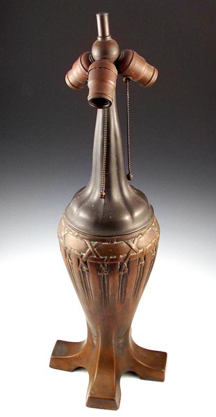 BASKET WEAVE HANDEL LAMP BASE: Basket weave style base. 3 socket with acorn pulls. Unsigned. Measures 26'' high. Please note on pull chain has come out, with lamp.