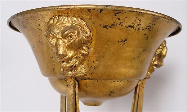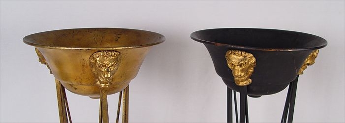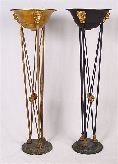 PAIR NEO-CLASSIC IRON BASE JARDENIE TORCHERES: Lion head masquerons at the top of each of the iron legs, claw feet at the bottom. One with gold leaf finish, other black painted finish. 51 1/4'' high x 16'' dia. at top. Please note paint loss.