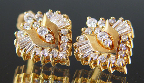 42 DIAMONDS AND GOLD EARRINGS: 14K yellow gold earrings with 30 round brilliant cut diamonds and 12 tapered baguette cut diamonds. Approx. .50 ctw. The diamonds average SI in clarity and G-H color. Prong set. Post and nut closure. Weight is 3.2 grams.
