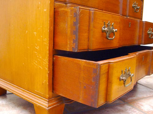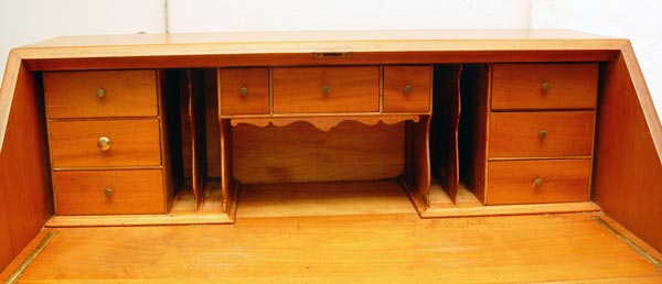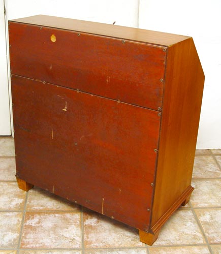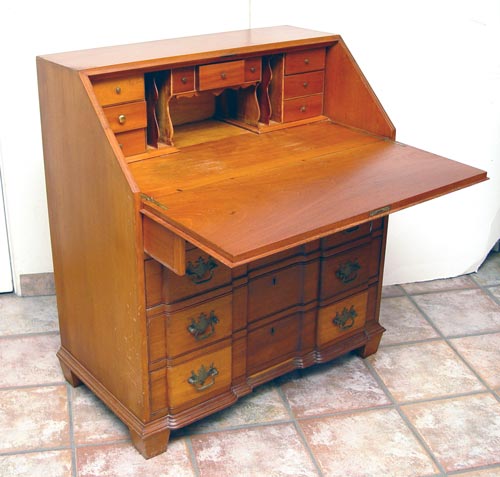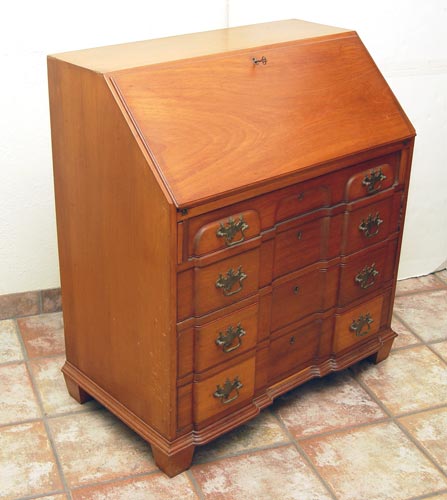 MAHOGANY BLOCK FRONT SLANT FRONT DESK: Automatic mechanical supports hold the fall front in place. Interior drawers and pigeon holes over 4 full length drawers with mahogany interiors. Note small wood chip in upper side edge. Measures 38'' high x 33 1/2'' wide x 19'' deep.
