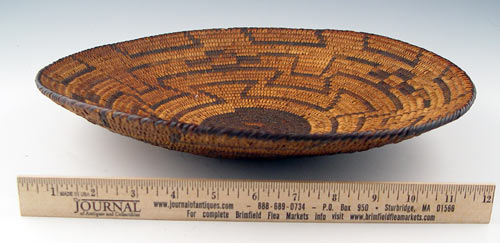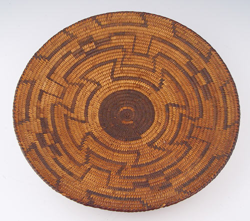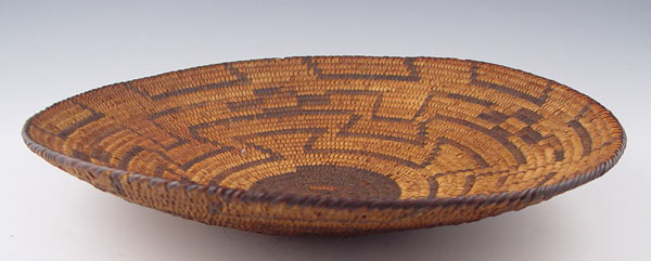 SOUTHWEST INDIAN COIL GEOMETRIC COIL WOVEN BASKET: Southwest Indian, possible Apache, coil woven tray basket with geometric design. Shows nice age, no damage. Measures 13 5/8''.