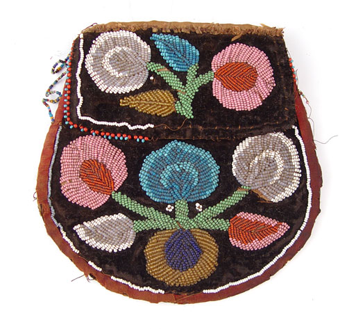 IROQUOIS BEADED PURSE / POUCH: Circa 1900 hand stitched bead pouch or purse. Iroquois Indian. Measures 6 3/4'' x 5 3/4''. Please note missing beads.