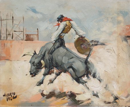 VELA, Alberto Ruiz, (Mexican/American, 1920-): Bullrider, OIL/C, 14'' x 17'', signed, unframed. Needs cleaning.
