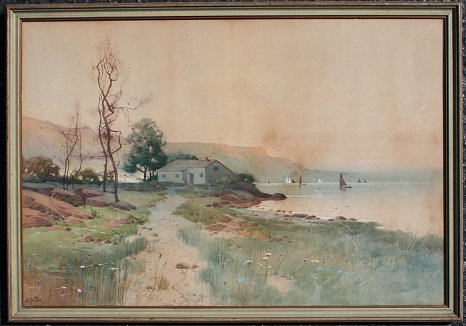 HARTSON, Walter C., (American, 1866-?): Shoreline Scene with Boats, W/C, 13 3/4'' x 20 1/2'', signed, framed, 15'' x 21 1/2''. Some staining from backing.