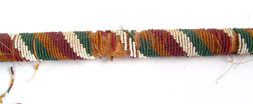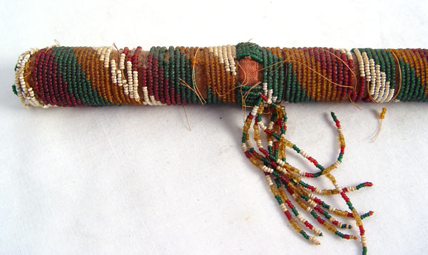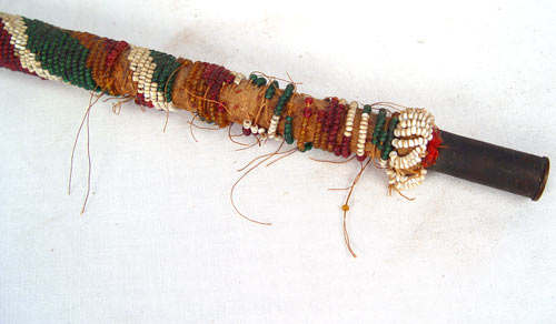 SOUTHWEST INDIAN GLASS BEADED CEREMONIAL STICK: Circa 1900 red, yellow, green and white glass beads over cloth cover over wood. 44 cal spent Winchester shell tip. Measures e missing buttons, nose, cracks to wood. Has been recently mounted on modern base. 37'' long. Please note missing beads.