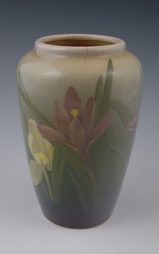 ROOKWOOD POTTERY VASE PAINTED BY SARA SAX: Floral decorated standard glaze executed by Sara Sax. Shape 938, date mark 1911. Please note inch long hairline. 6 1/4'' tall.