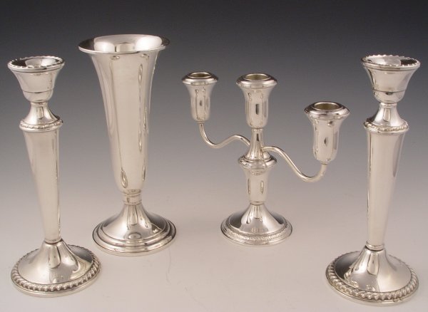 4 PIECE ESTATE STERLING LOT TRUMPET VASE, CANDLESTICKS: To include Gorham weighted sterling trumpet vase 8 3/4'' high. Pair of Rogers weighted sterling candlesticks 8 3/4'' high. Lord Silver Inc weighted sterling 3 candelabrum. 7 1/4'' high x 9'' wide.