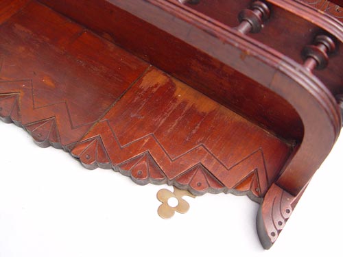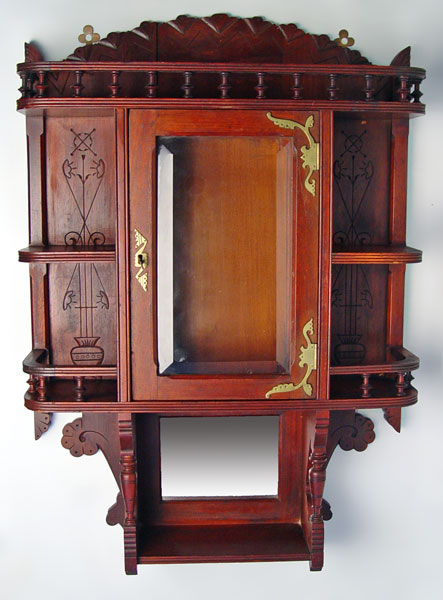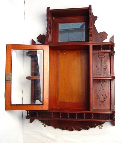 VICTORIAN CARVED MAHOGANY WALL MOUNT CABINET: Carved with 3 shelves and gallery on top. Beveled glass front, brass accents. Mirror on lower section. Measures 35 1/2'' high x 24 1/4'' wide x 7'' deep.