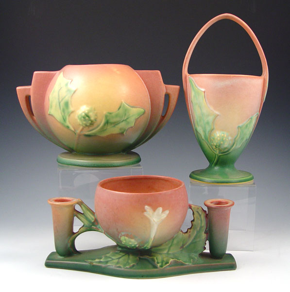 3 PIECE THORNAPPLE ROSEVILLE POTTERY LOT: All in pink. 1) #305-6''. 2) #313 11'' long. 3) Basket 342-10''.