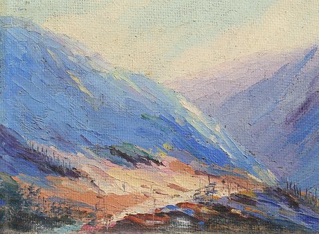 EWING FLYING IRON, (American, 20th C.): ''Avery Pass'' Missoula Range, Montana Rockies, Oil/Masonite, 5 3/4'' x 8'', signed, framed, 7'' x 10'', label affixed verso.